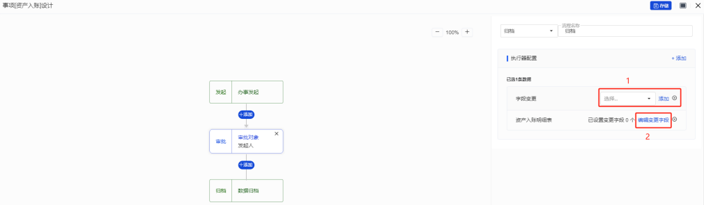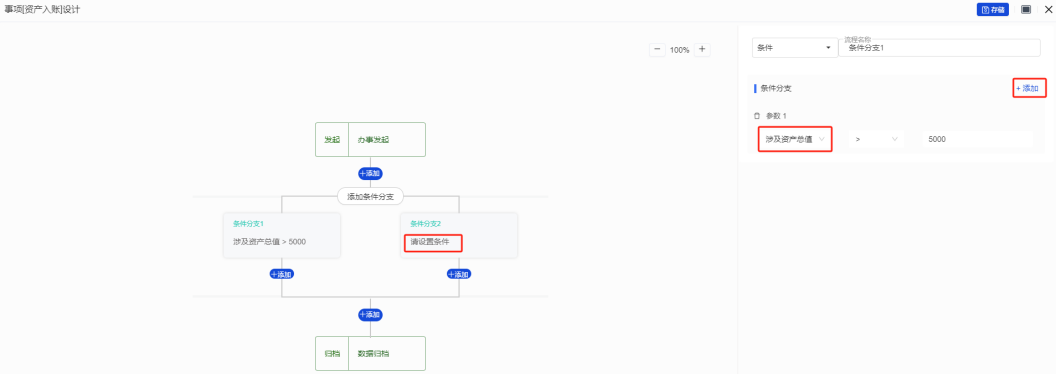 例如下图,可配置涉及资产总值>5000与<=5000的资产走不同的办事审批流程。