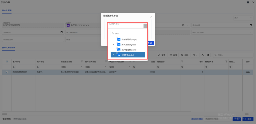 以处置办事为例。点击数据>单位名称>预算一体化资产管理模块。