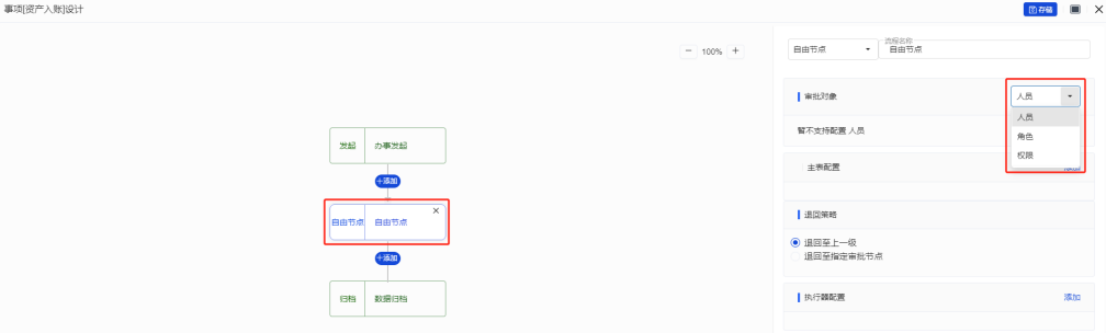 流程选择自由节点,配置审批对象为人员、角色、权限。