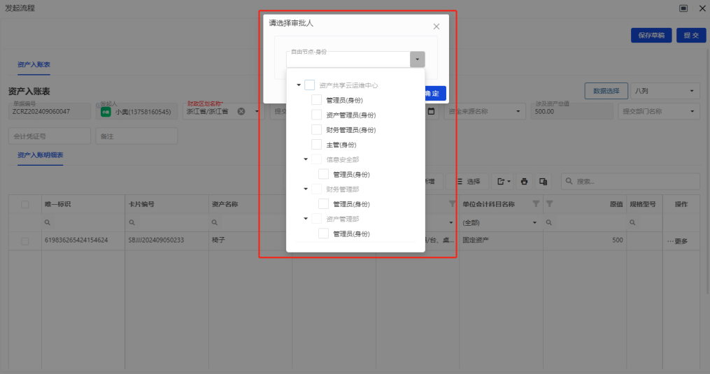 权限配置选择权限名称,即每一层部门需要哪个角色审批才会进入上一级部门。