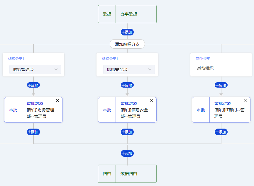 根据单位实际情况配置审批分支,如下例子配置三个分支,分别是财务管理部、信息安全部、其他组织。配置完成点击右上角发布按钮,保存配置。