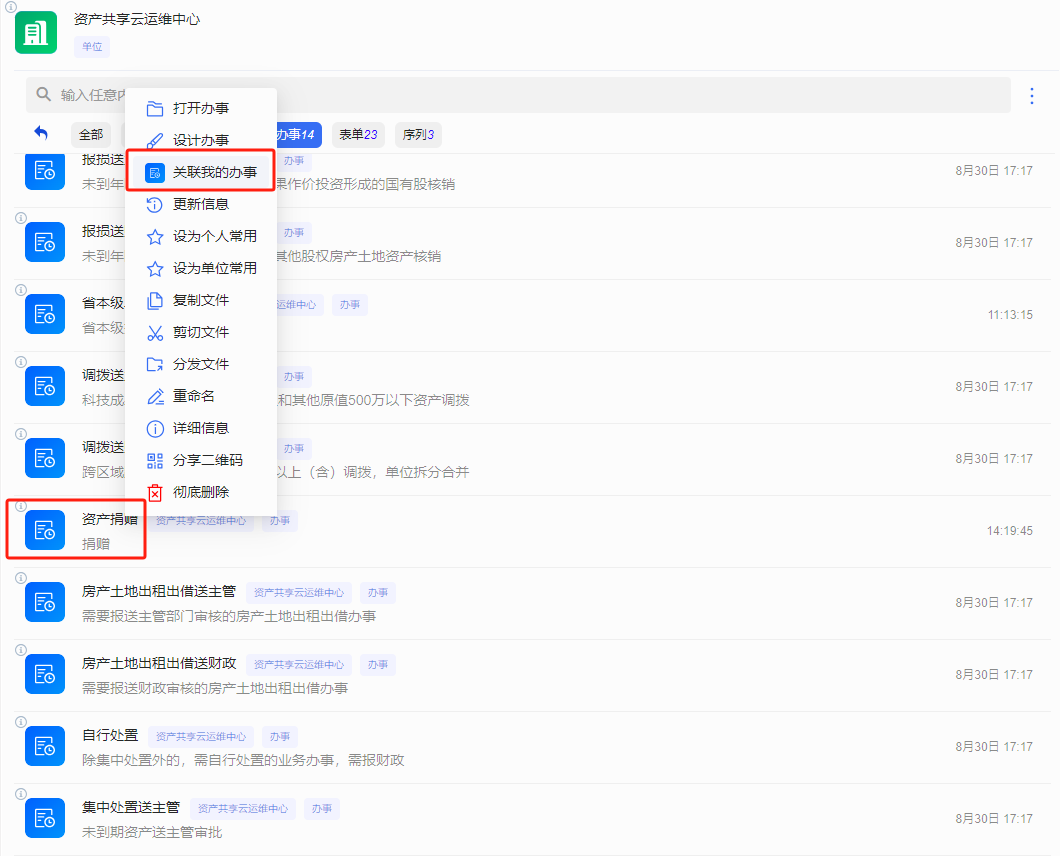 单位找到步骤①中的办事,右键点击,选中关联我的办事。
