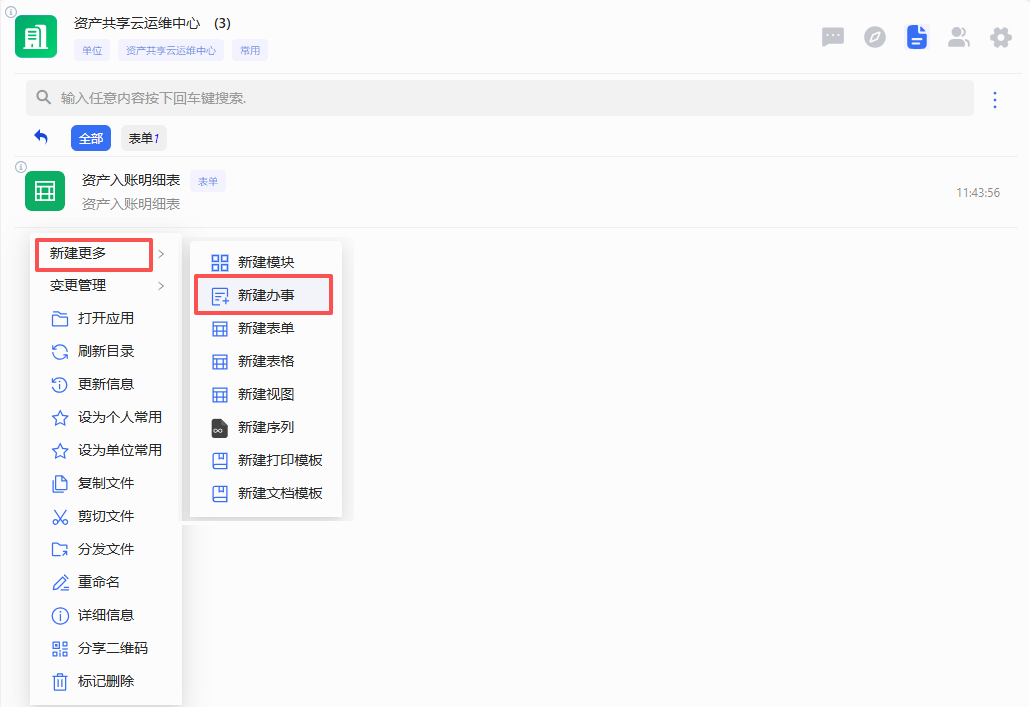 点击单位下的应用模块,点击前文创建的测试应用,在页面空白处,点击鼠标右键,新建更多>新建办事。