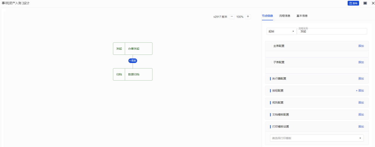 发起节点可配置主表、子表、执行器、按钮、规则、文档模板、打印模板。