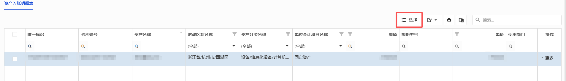 勾选“选择”选项,打开办事明细表上方出现“选择”按钮,点击该按钮,可以选择单位内的数据。