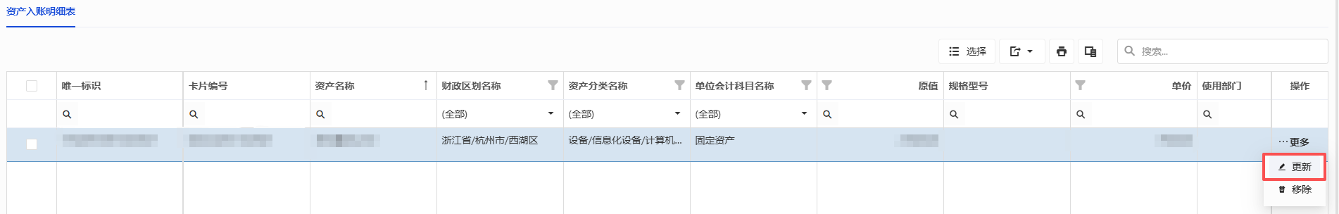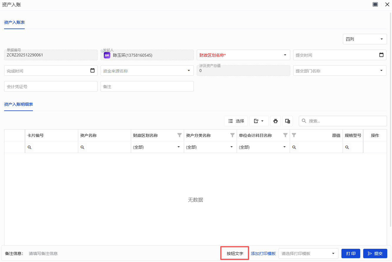 勾选“新增”选项,打开办事明细表上方出现“新增”、“导入新增”、“匹配导入”按钮。“新增”功能手动录入单条的资产数据,“导入新增”和“匹配导入”通过excel导入资产数据。
