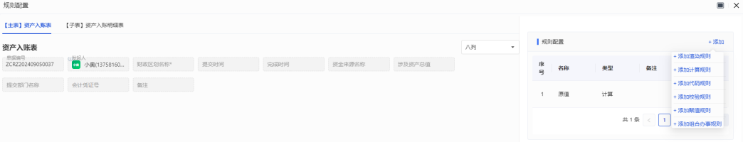 例如下图,为主表资产入账表的涉及资产总值字段配置计算规则。