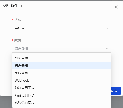 可以选择在审批前或者审批后配置执行器。执行器有数据申领、资产领用、字段变更、Webhook、复制表到子表、商品信息同步、台账信息同步等7 种类型。