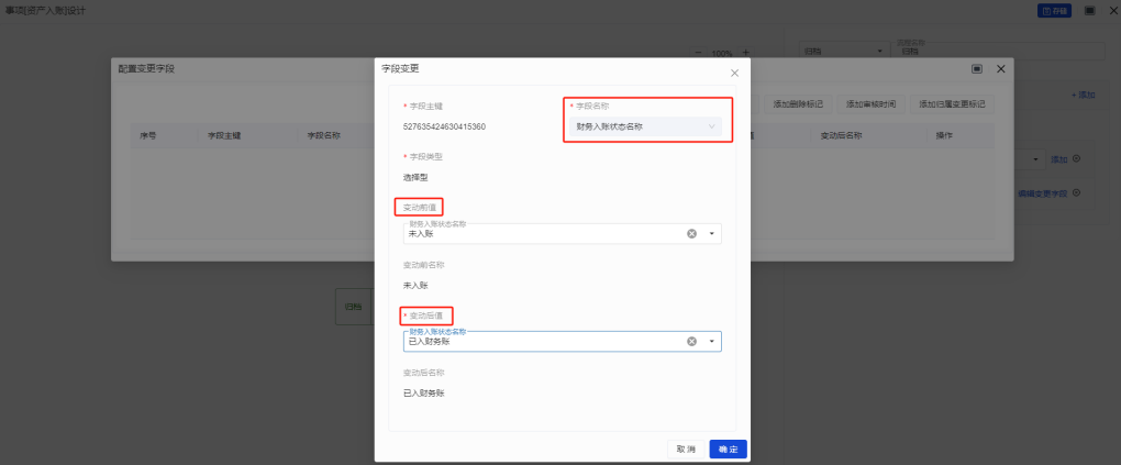 如资产入账办事流程,如下图添加资产入账明细表的财务入账状态名称字段,配置变动前和变动后的值分别为未入账和已入财务账,当流程审批后,资产卡片的该字段将会发生变更。