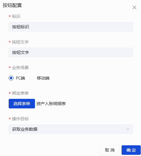 标识用于区分不同的按钮,按钮文字为交互界面中按钮上的文字,PC端和移动端用于实际的业务场景。绑定表单为获取信息的表单,操作目标可选为手动规则,手动执行器,获取业务数据。当前操作目标仅可选择获取业务数据。