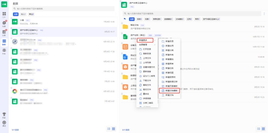 点击数据>本单位名称>预算一体化资产管理模板,空白处点击鼠标右键>新建更多>新建文档模板。