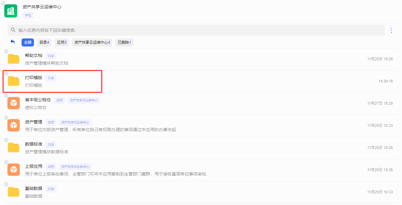 点击数据>双击单位名称>点击资产共享云平台群,右键点击打印模板文件夹,选中复制文件。