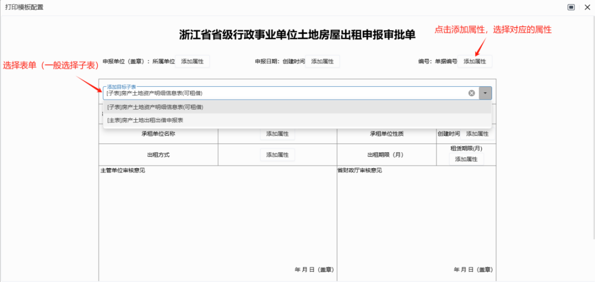 添加属性值类型的元素可展示属性的值,一般用于绑定办事中主表的属性,需要在页面右侧绑定主表表单的属性。