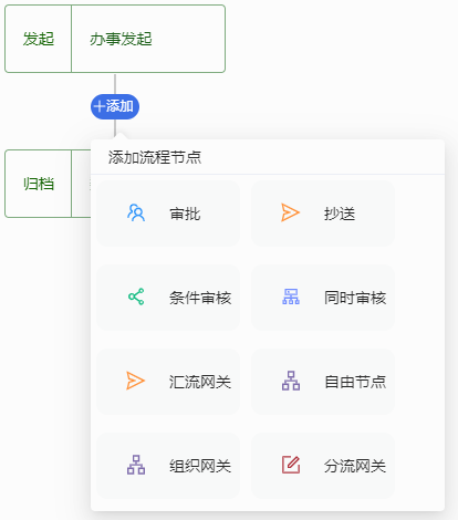 点击添加按钮,如下图展示了8种流程节点,下文讲解8种审批节点的配置。单位可按照自身需求配置。