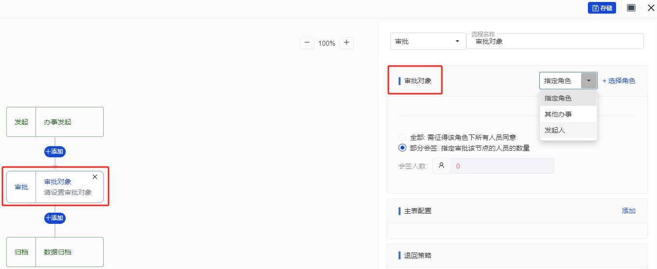 选中审批节点,右侧可设置审批对象。审批对象可以是发起人、指定角色、或者串联到其他办事。