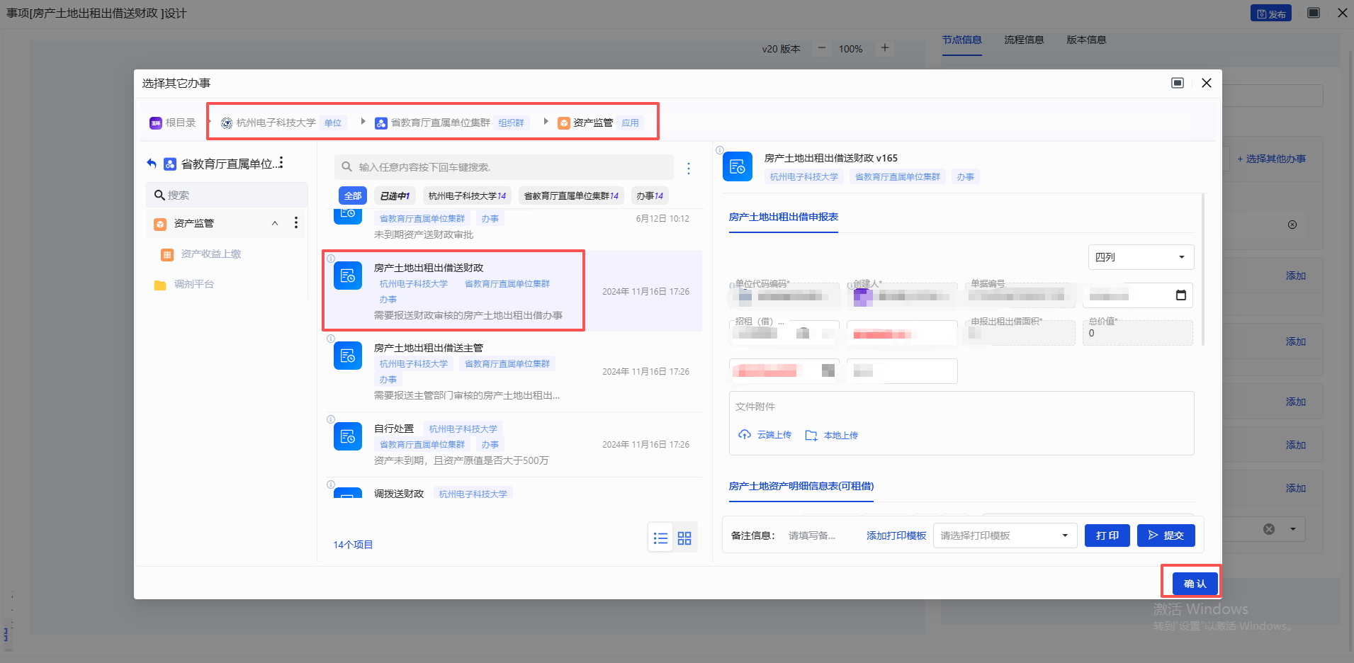 在弹出选择其他办事窗口中,选择上级主管的审批办事。如下图,房屋土地出租出借送财政办事,选择主管集群中的对应办事,点击确认按钮。