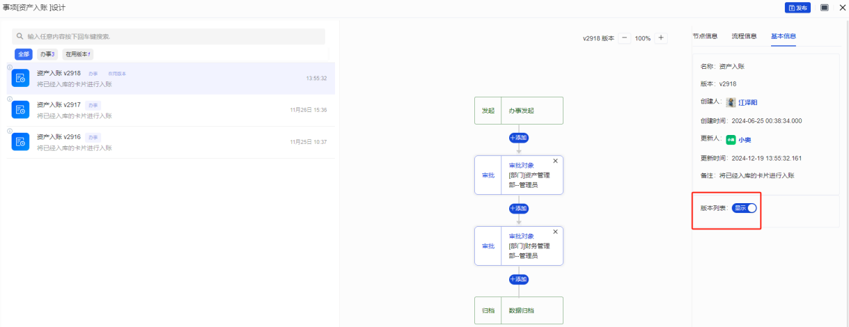 切换版本后,新发起的流程使用当前在用版本,已发起的在途流程仍旧使用旧办事版本。