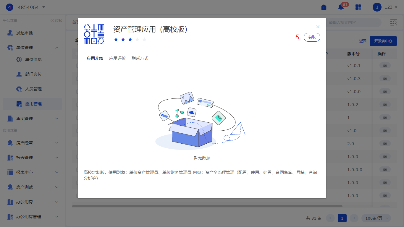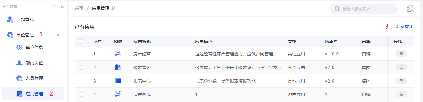 只有单位管理员才能看到应用市场菜单,进入应用市场获取应用