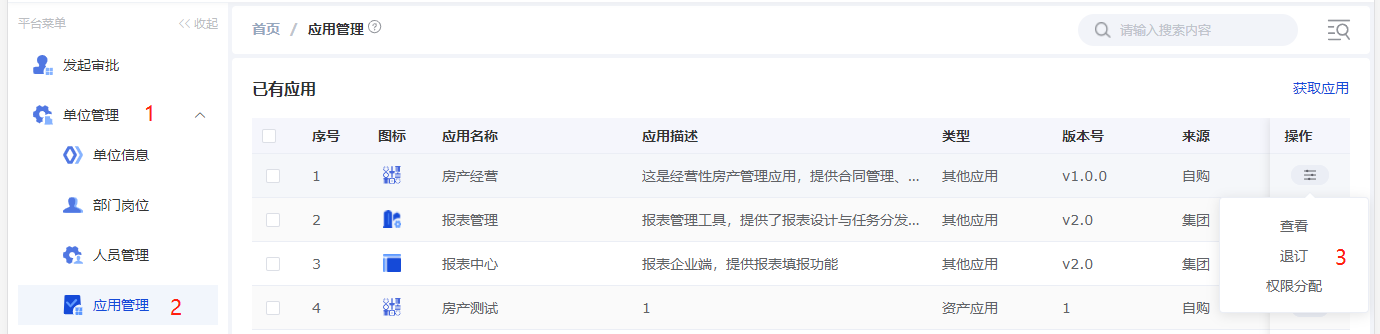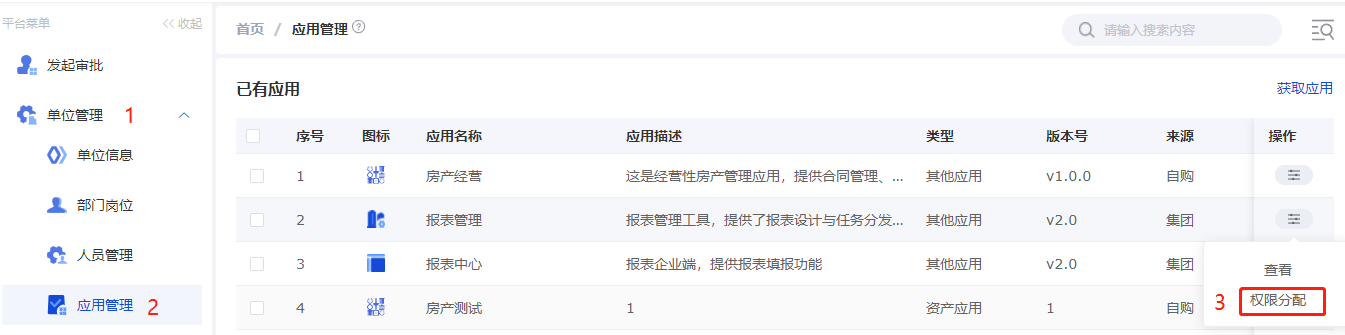 - 进入单位或集团应用中心,将应用分配个人或分发单位。