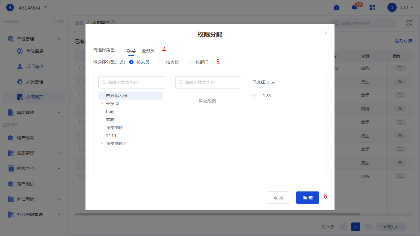 单位管理获取应用或者被集团分配应用之后,需要将应用分发给用户,支持分配到人员、部门、岗位