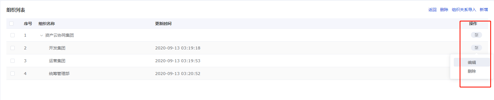 - 把鼠标移到对应组织的【操作】一栏有弹出【编辑】按钮